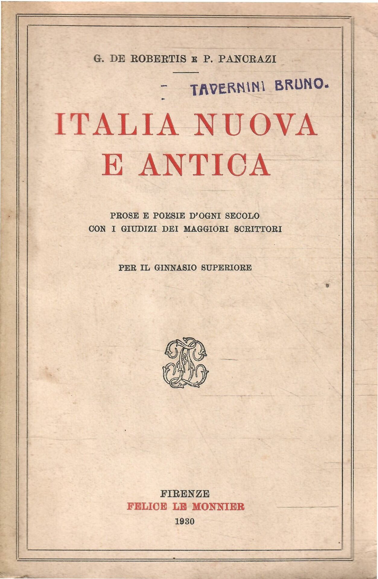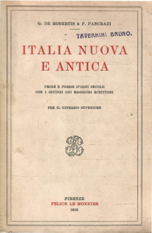 ITALIA NUOVA E ANTICA – PROSE E POESIE D’OGNI SECOLO CON I GIUDIZI DEI MAGGIORI SCRITTORI PER IL GINNASIO SUPERIORE